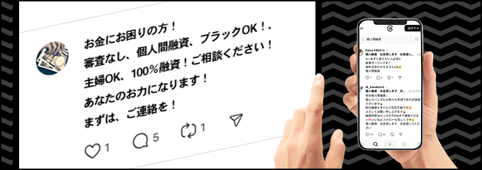 現代の闇金は、Twitter(X)、Instagram、FacebookといったSNSを主な活動場所としています。「#お金貸します」「#個人間融資」「#ブラックOK」「#即日融資」などのハッシュタグでお金に困っている人を探し、DMでLINEへ誘導するのが典型的な手口です。これは大竹市の南栄や西栄、油見といった人口の多い地域でも例外ではありません。